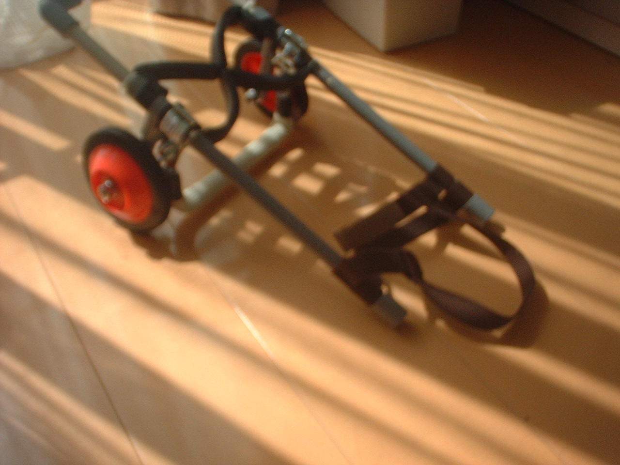 飼い主も大慌てで、俄かに車椅子などネットで調べ自作することになった。 上の写真がそれである。