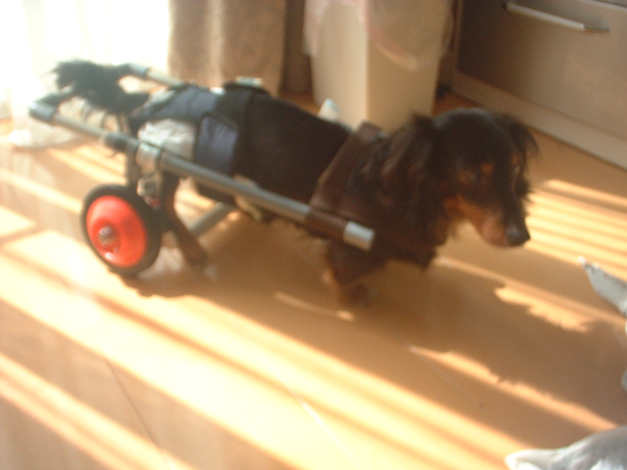 装着後のらん君はそれなりに少し歩くが、まだ乗りこなせていない。 医師は回復の可能性も捨ててはいないが1ヶ月以上はかかるだろうとのこと。 しばらくは家族で被介護状態の犬を世話しなくてはならない。